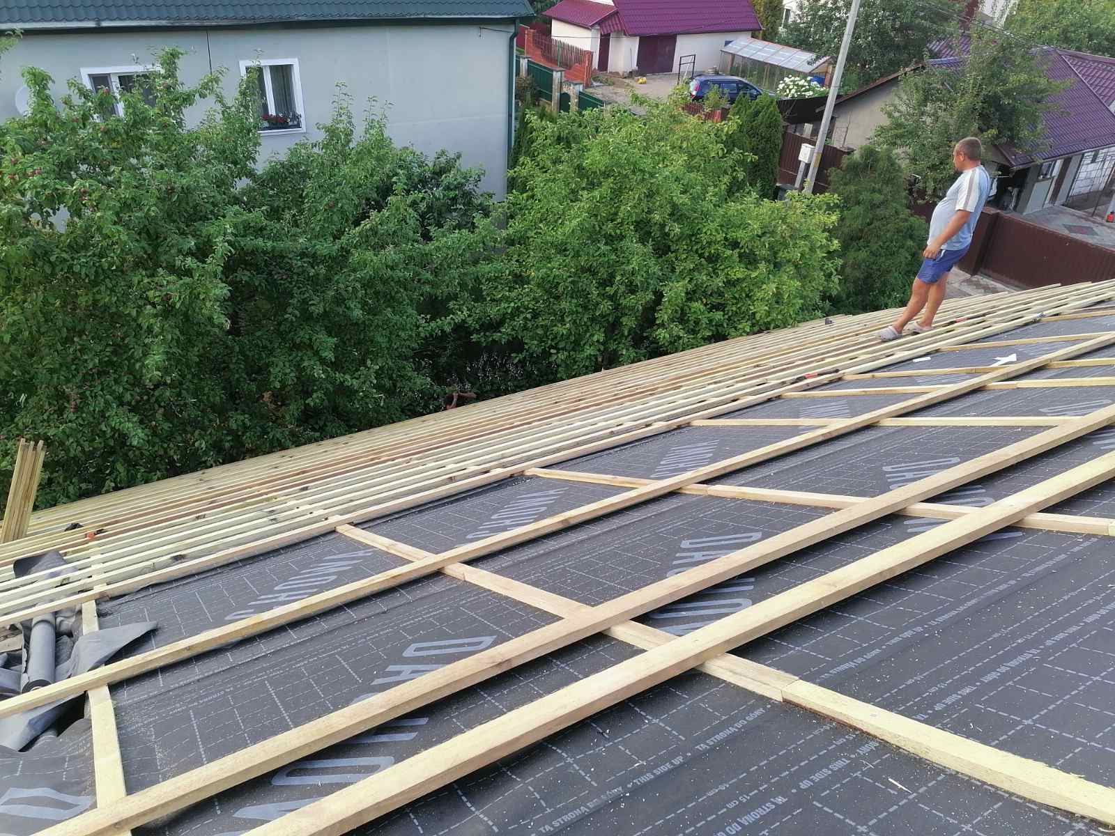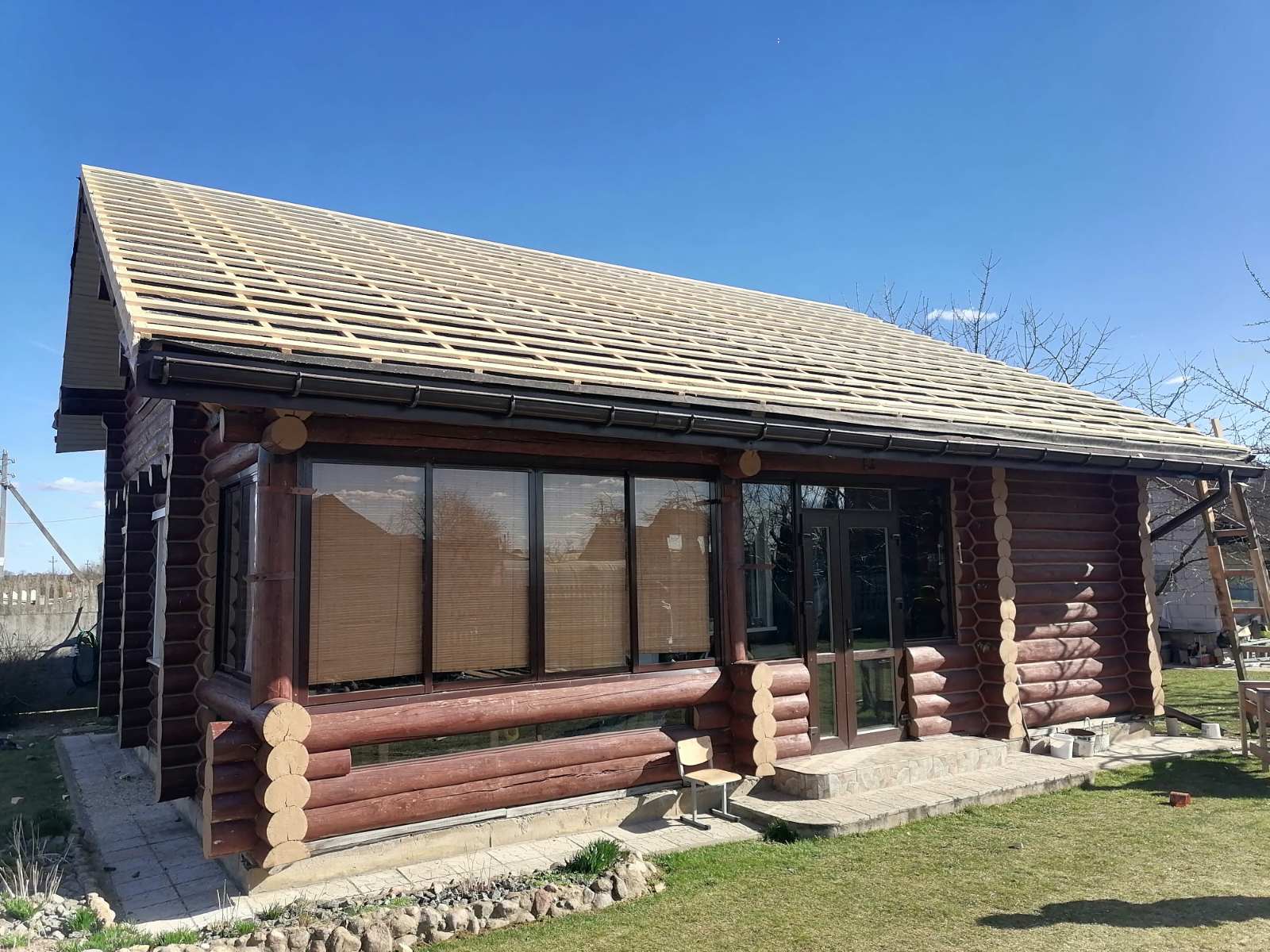 Полный демонтаж кровли ,Монтаж двухскатной кровли битумной черепицы с выносной стропилой с терассой, монтаж балок перекрытия, установка вент выходов 2 шт.