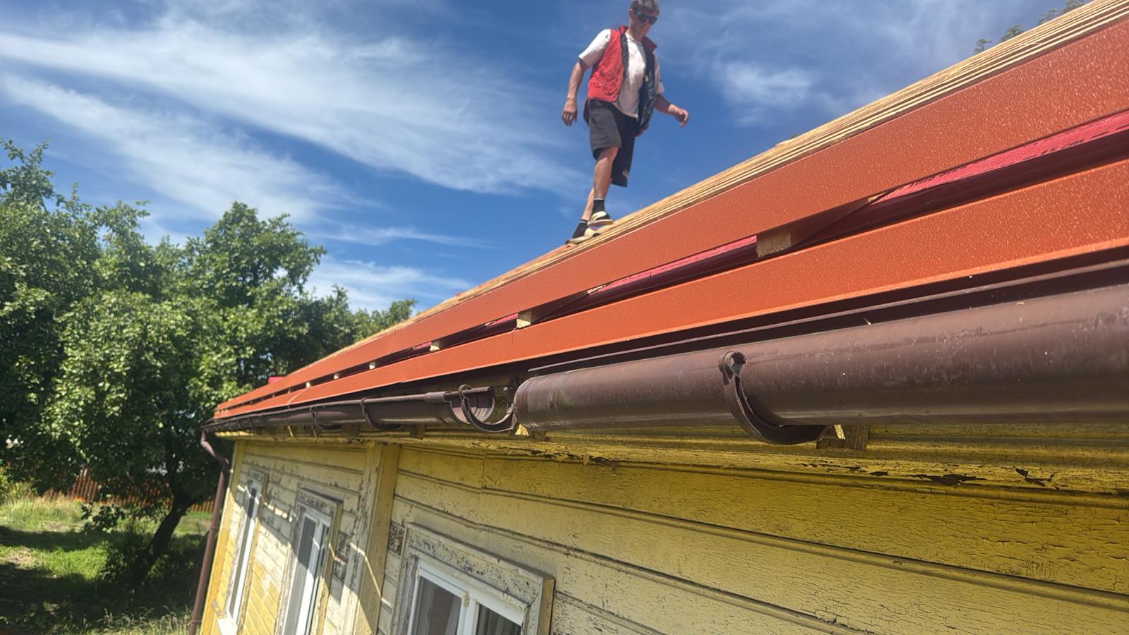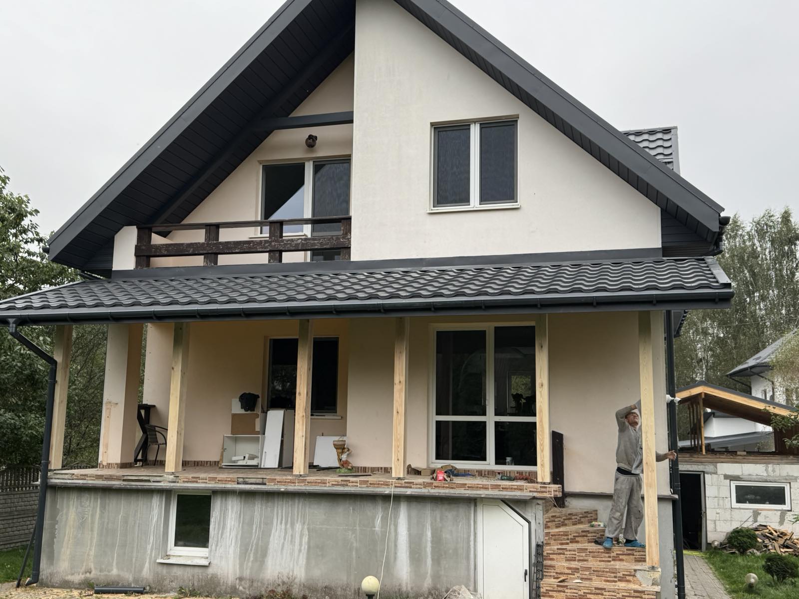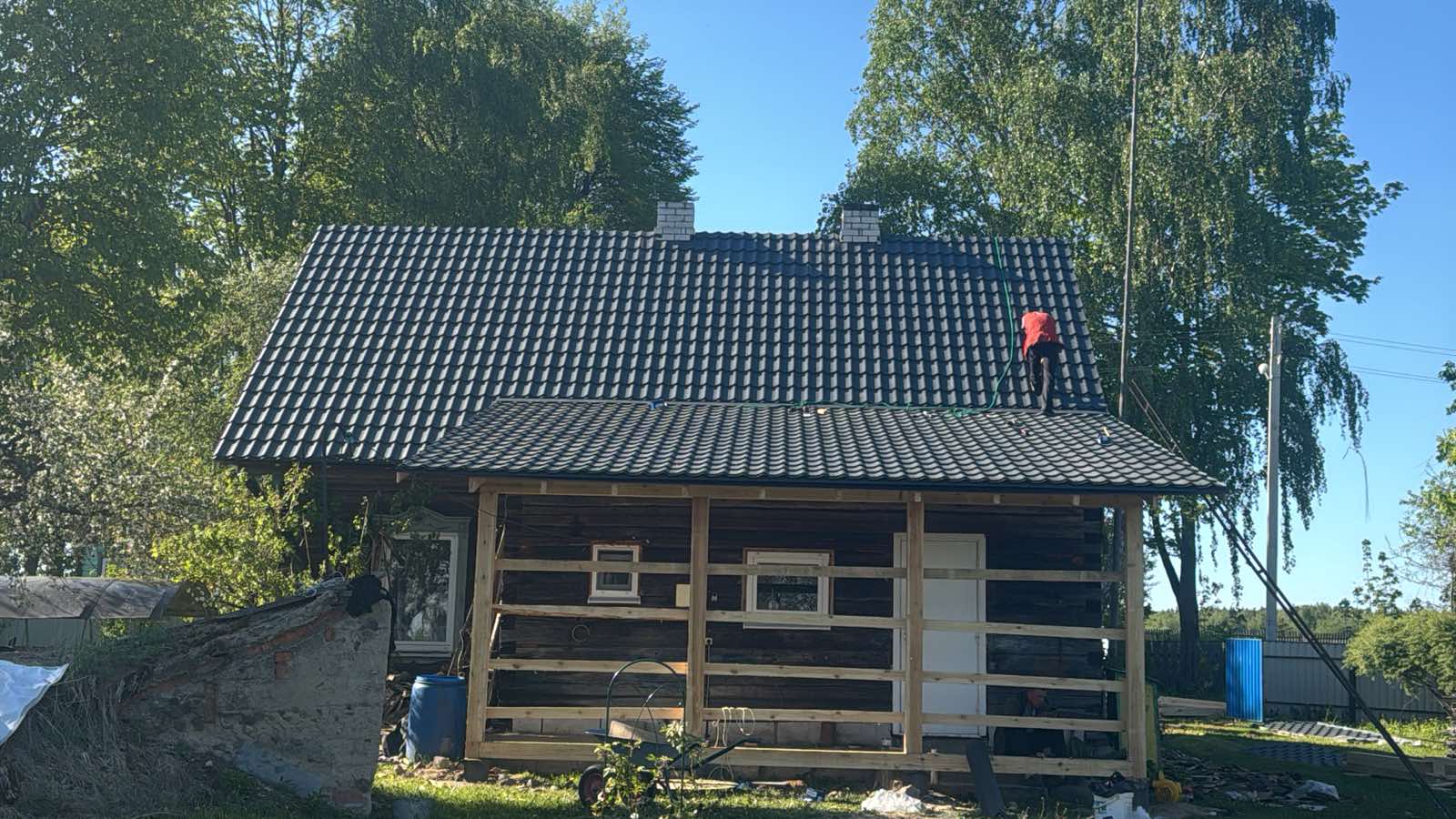 Полный демонтаж кровли в д. Ратынцы 11,монтаж двухскатной кровли металлочерепицы монтере с террасой, монтаж франтонов, подшивка свесов, установка водосточной системы.