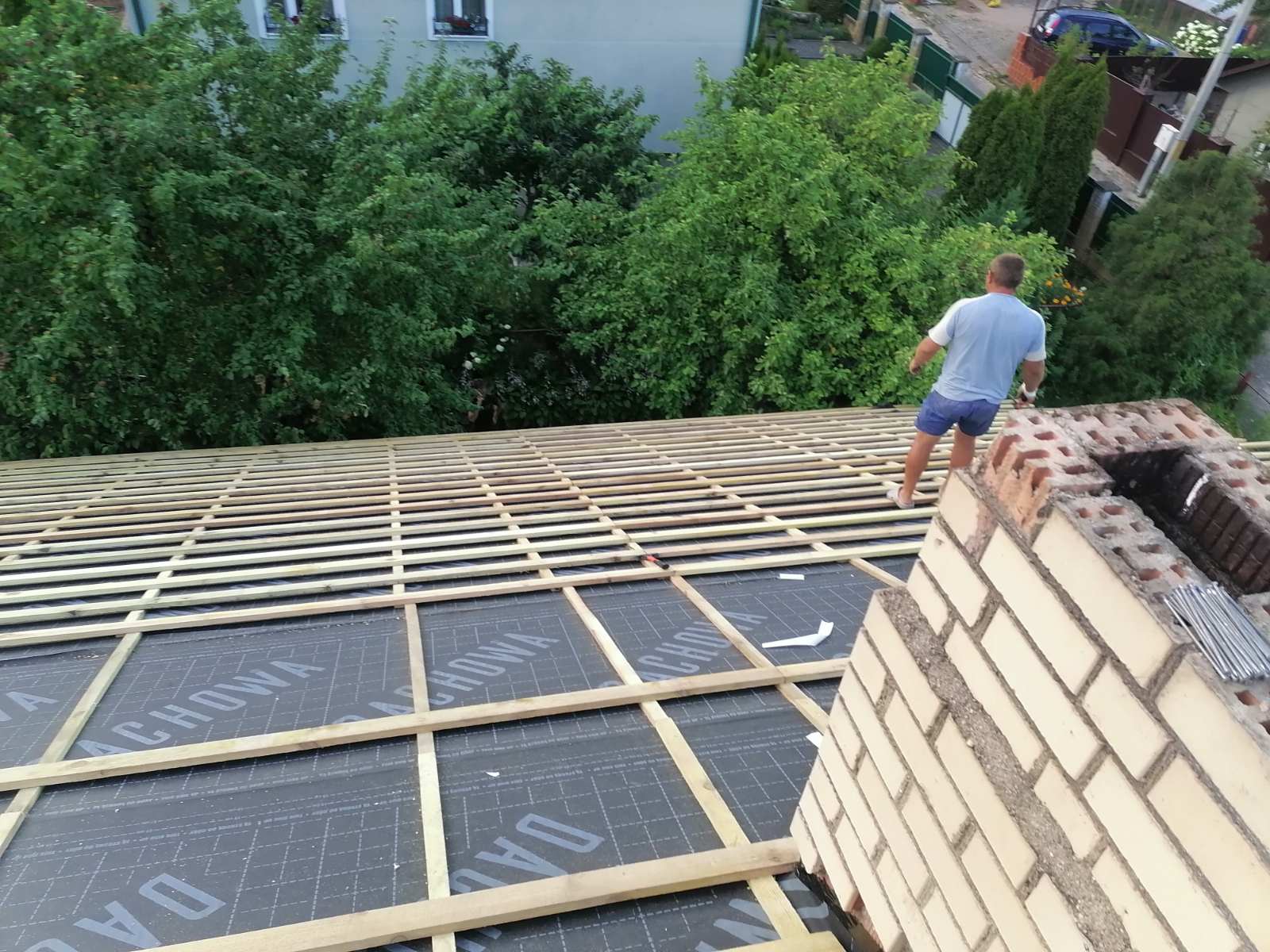 Монтаж классической двухскатной кровли с выносом стропил г. Смолевичи. В качестве кровельного покрытия использовалась металлочерепица Трамонтана, монтаж балок перекрытия, монтаж вентиляционный выход 2 шт.