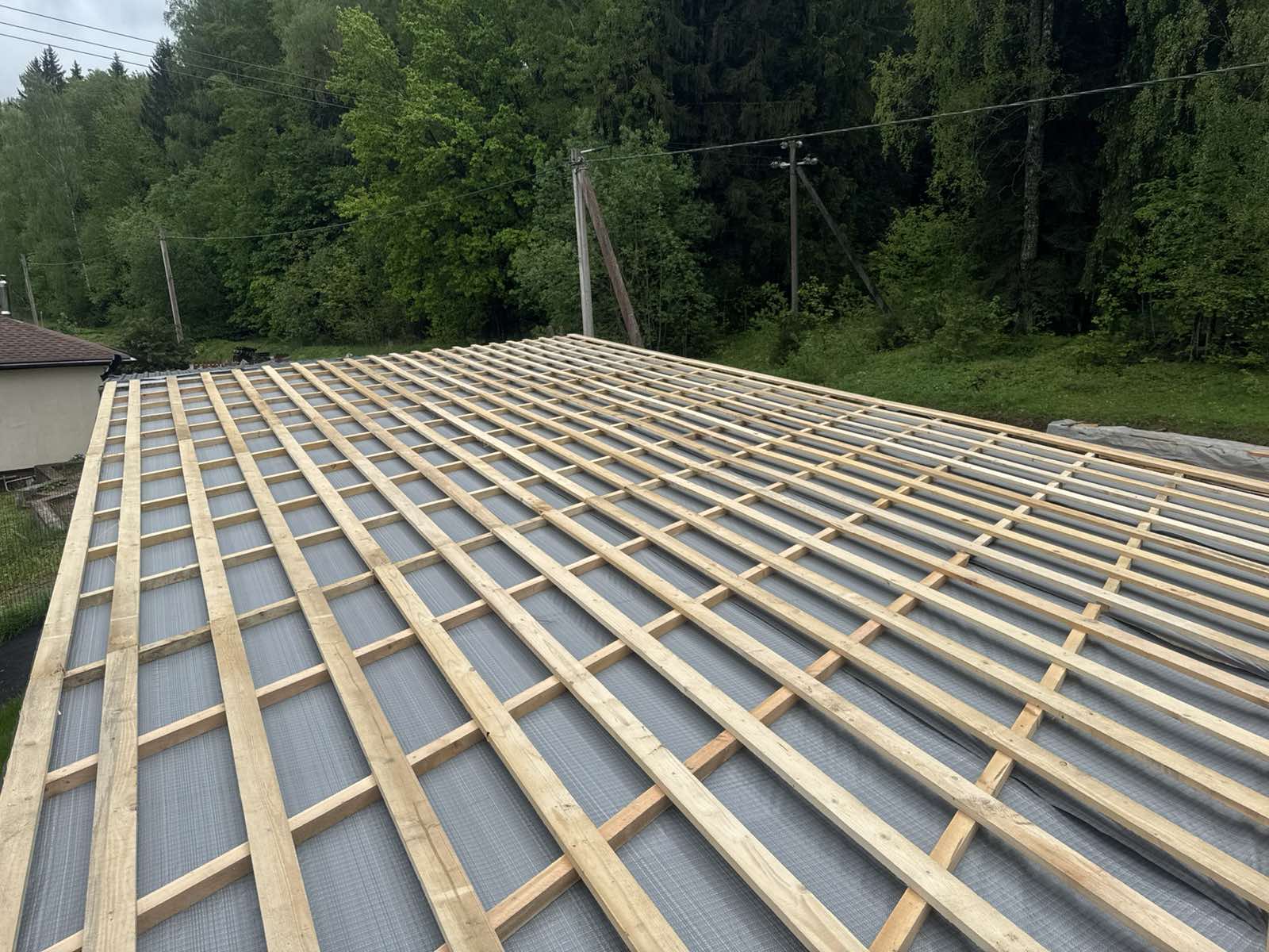 Данный объект был реализован нашими мастерами в д.вераги.Произведена: установка стропильной системы, монтаж обрешетки, укладка металлопрофиля.