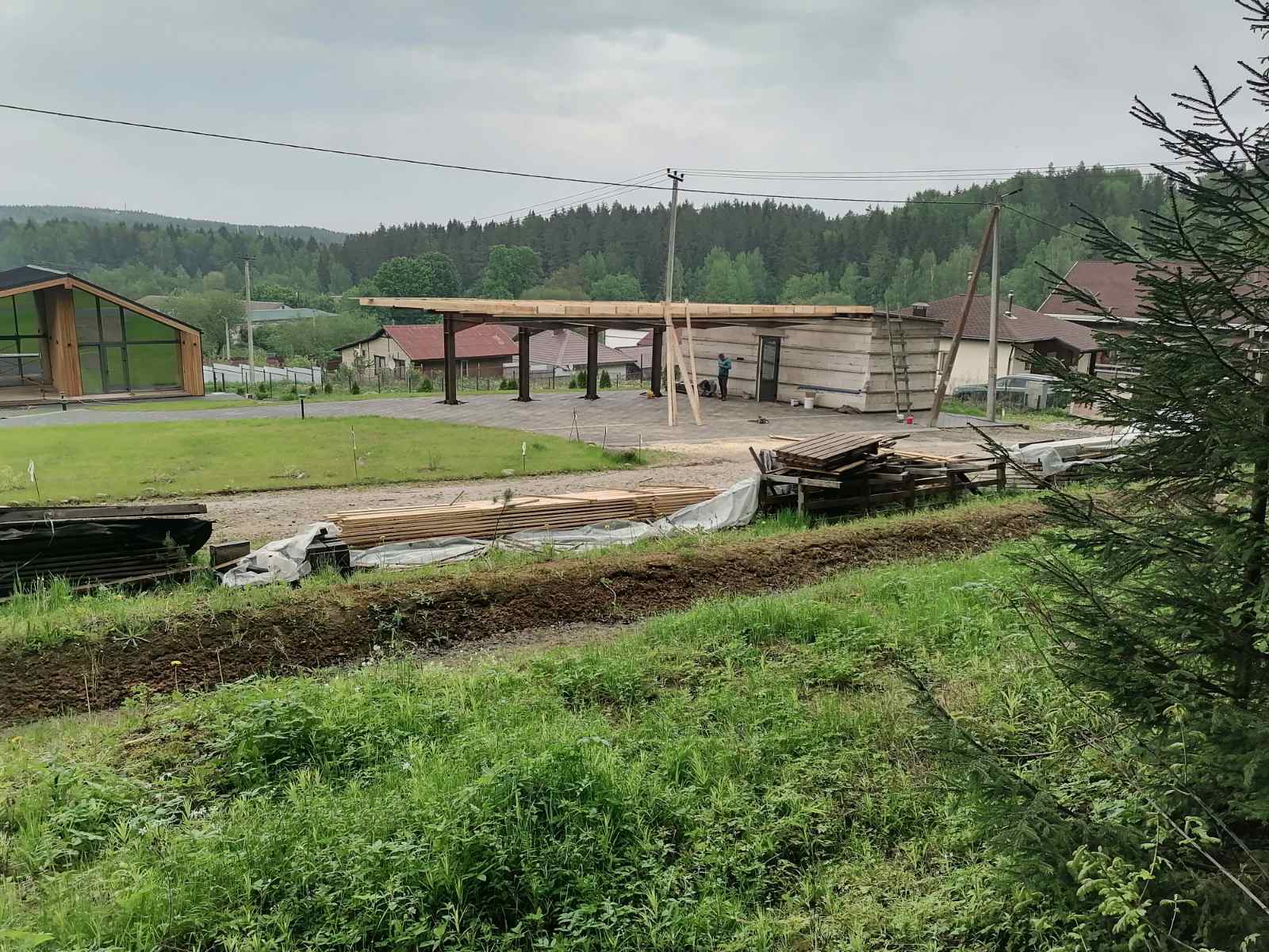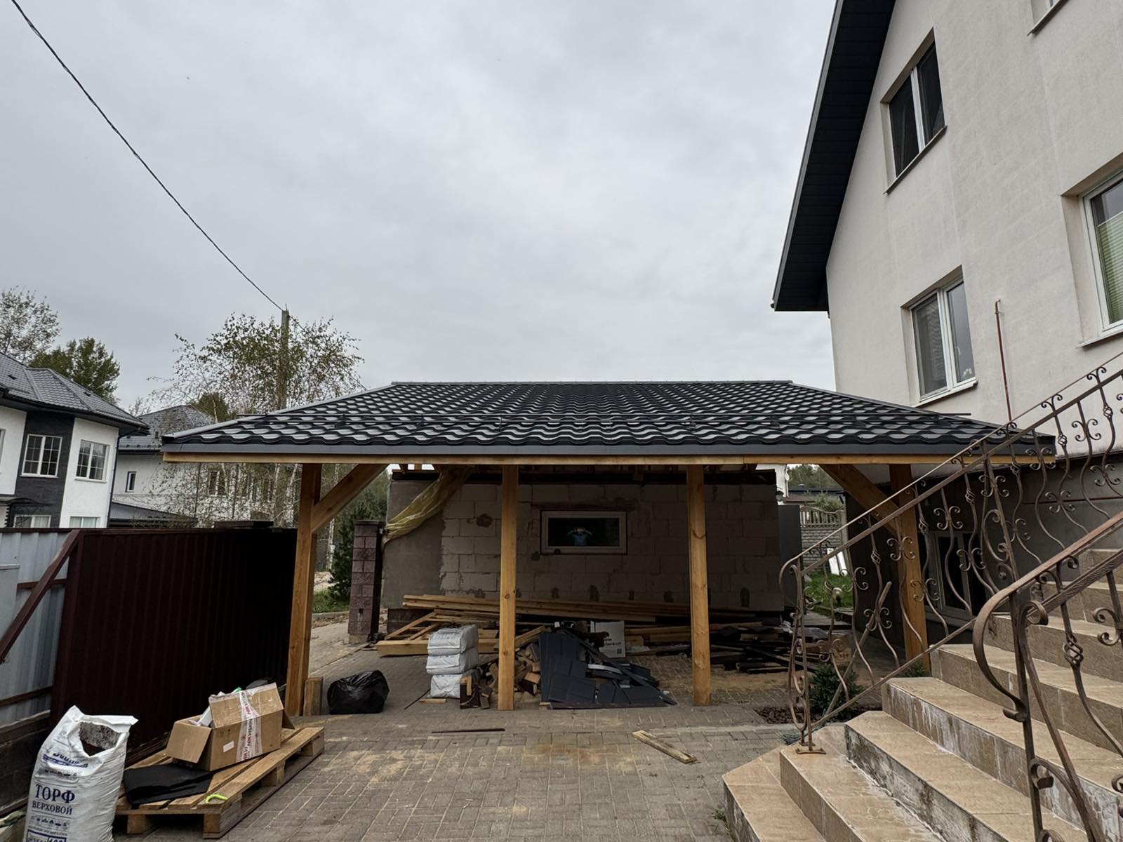 Монтаж двухскатной кровли с выносной стропилой с терассой, монтаж балок перекрытия, обшивка 2 труб, утепление кровли по стропилам, установка крюков для водосточной системы монтаж хозблока с выностой стропилой.