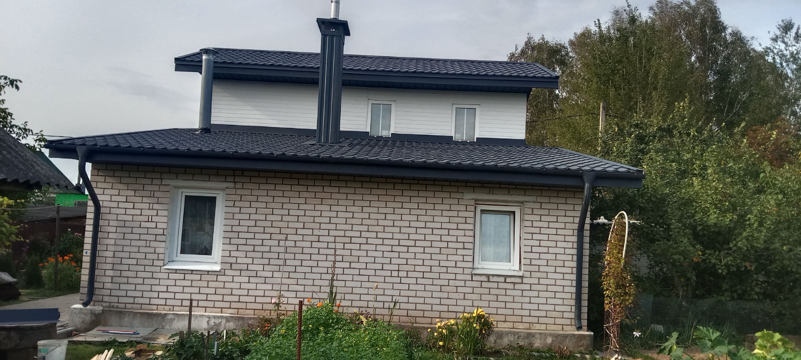 Данный объект был реализован нашими мастерами в СТ "Полиграфист. Произведена: выравнивание плоскостей, монтаж новой обрешетки, укладка металлочерепицы , подшивка свесов софитами , установка водосточной системы,обшивка фронтонов, обшивка дымохода.