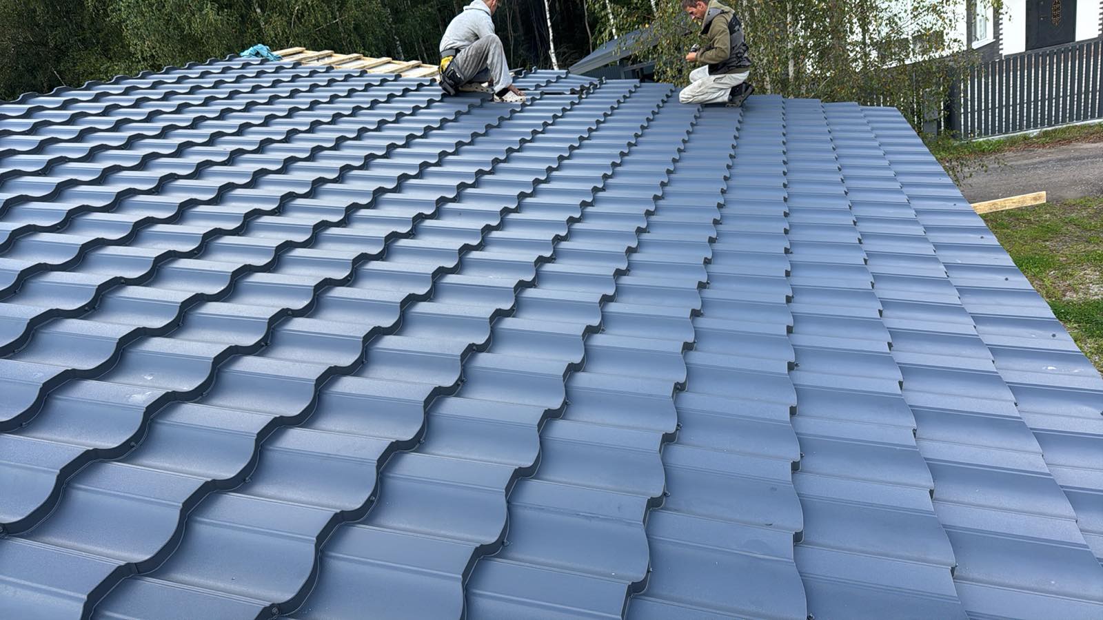 По рекомендациям наша бригада приехала на объект нового строительства вальмовой крыши с дормерами (кукушками) на три стороны. Выравнив плоскости стропильной системы, установила супердеффузионную мембрану и обрешётку. Затем приступила к монтажу модульной металлочерепицы с доборными элементами и обшила вентканалы.